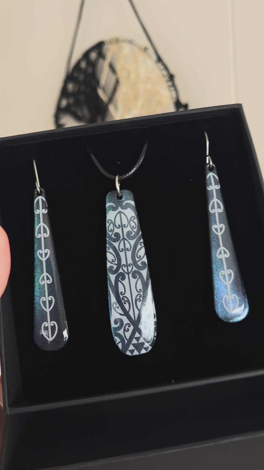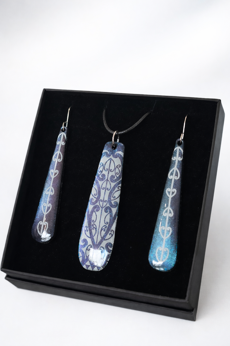 Featuring flowing Māori-inspired patterns layered over a blue teal purple shift base, each piece catches the light with the same iridescent glow seen in a tūī’s feathers. The sculptural pendant echoes the rhythm of birdsong, while the elongated earrings create a balanced, statement finish that feels grounded yet expressive.