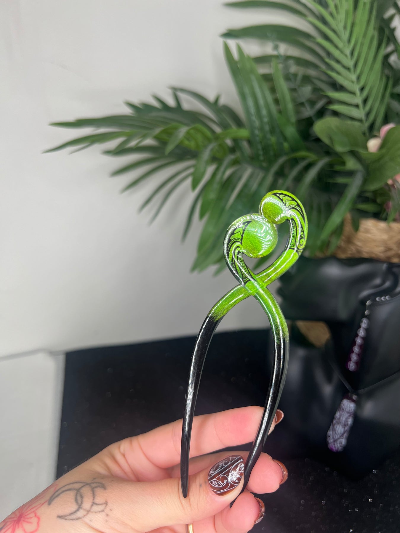 This is a double-sided heru with two koru facing inward, curved toward one another in a protective way. One side is deep ngahere green, the other a calm ocean blue. They feel different, but they belong together. To me, it feels like husband and wife… or balance… or just that knowing that you’re not doing life on your own.